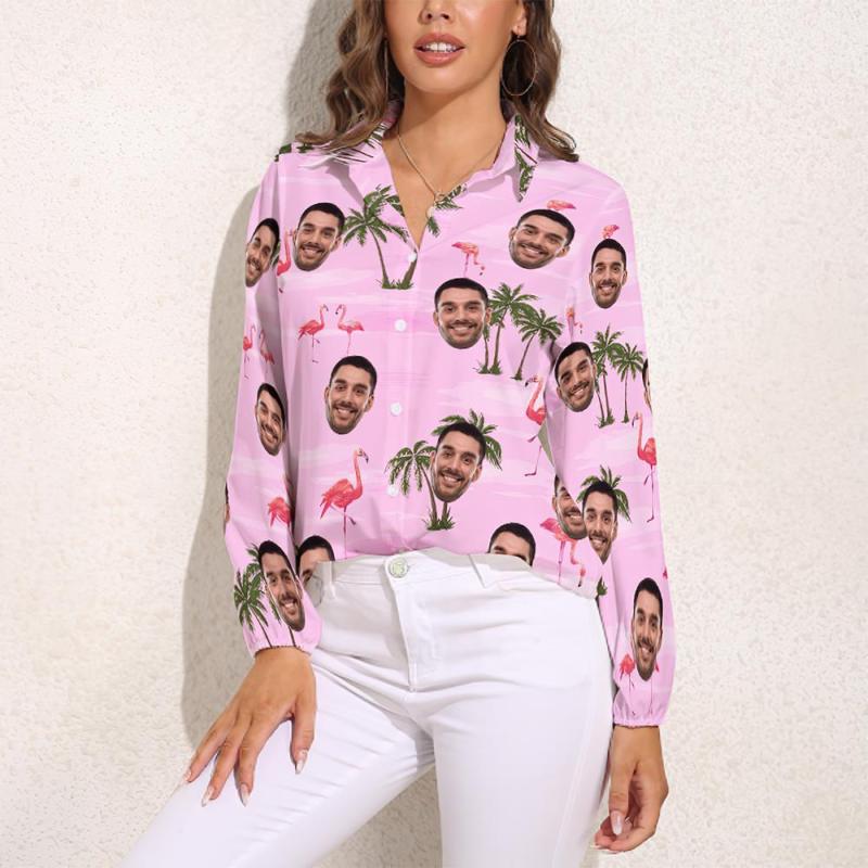 Custom Face Shirts Pink Flamingo Vintage Long Sleeves Hawaiihemden für Frauen