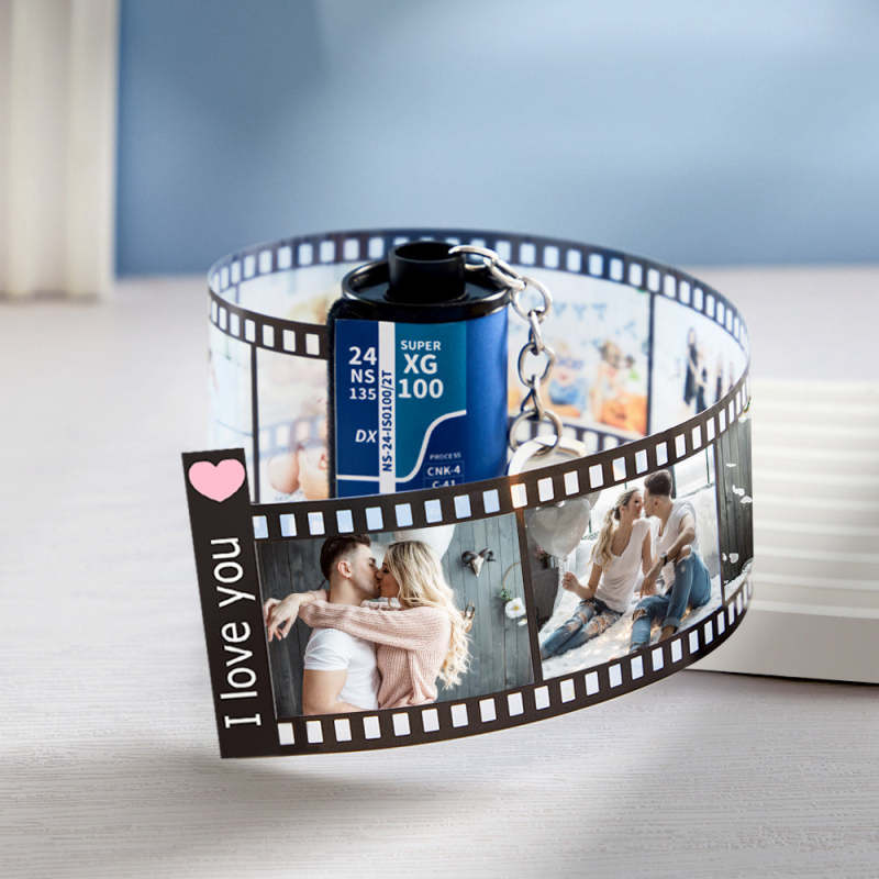 Personalisierter Foto- Und Text-filmrollen-schlüsselanhänger. Blauer Kamerarollen-schlüsselanhänger